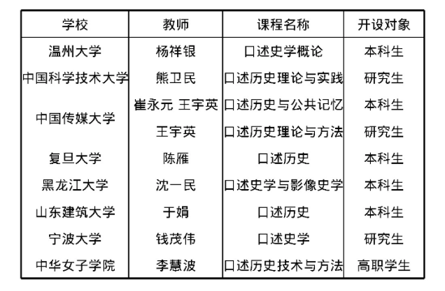 (4)口述历史课程进入大学课堂。早在1996年,北京大学历史系杨立文就为本校学生开设了“口述史学研究”课程,目前,一些高校也在陆续开设了口述历史课程(见表1),这对于壮大口述历史队伍和培养口述历史人才具有重要意义。