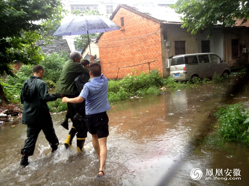 7月4日5时许,天刚微亮,太湖县公安局的救援队伍在太湖老城战斗了一夜,对身处危险地段的群众进行安全转移。在转移的过程中,救援队伍突然得到了一个消息,在老城有一名高龄老人家里进水,雨仍然在下,该老人随时有生命危险。接到该情报后,救援队伍来不及片刻的休息,火速赶往现场进行救援。