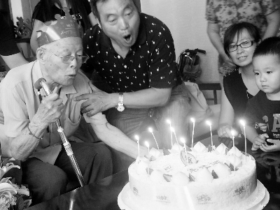昨天上午,除了赵振英的家人来为老人祝寿以外,还有几名他的学生从天津等地特意赶过来为他过百岁的生日。