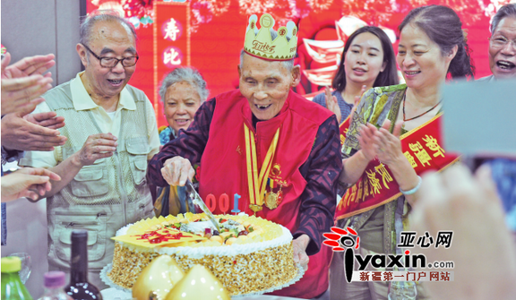 12时30分,“百岁生日宴”正式开始,大家高举酒杯祝福老人,并端上了生日蛋糕。随后,晚辈们依次上前,向老人拜寿。彭焕阳老人激动地说:“今天是我过得最开心的一个生日宴,今天是抗战胜利纪念日,是我们每个中国人的节日!”