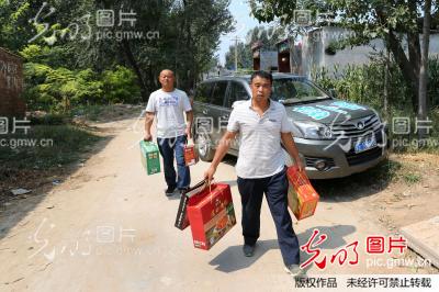 2016年9月30日上午,河南省滑县老店镇齐寨村,关爱老兵志愿者“放牧黄河滩”、爱心人士“萝卜哥”钞彦美手提慰问品,看望95岁的抗战老兵齐修体。