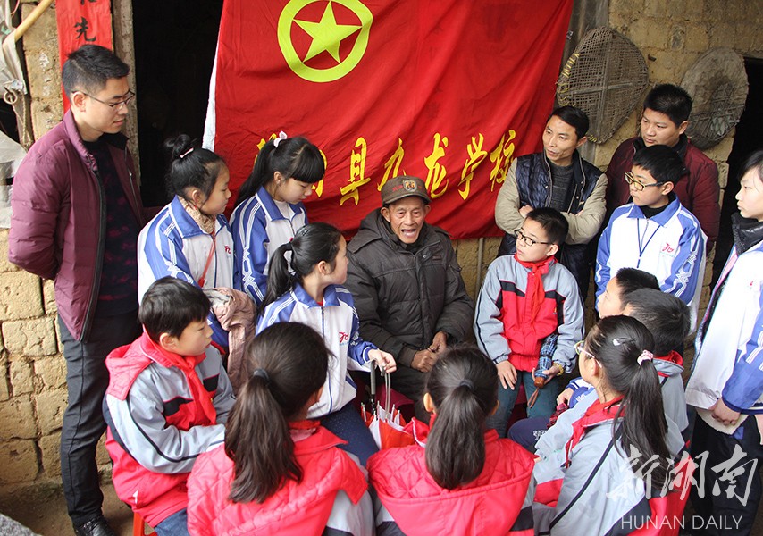 听老兵讲抗战故事 2017年03月24日 15:15 非萧 3月22日,隆回县九龙学校师生来到桃洪镇托杏村慰问95岁抗战老兵范松池,听老兵讲述当年的抗战故事,接受红色教育,激发爱国热情。 (来源:湖南日报新闻影像中心 时间:2017-03-23)