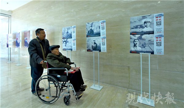 不少市民在展板前停留,掏出手机,扫描展板上的二维码,聆听战争岁月的家国情怀。