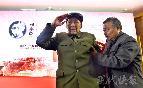 现代快报记者注意到,李高山老人年事已高,头发花白,坐在轮椅上,走路已经需要家人搀扶。在诵读活动现场,本来坐在轮椅上开始诵读的他,坚持要给观众敬礼。他颤颤巍巍地站起身来,缓缓地举起右手,台下响起经久不息的掌声,为这位当年挺身而出,奋起抗争的老兵鼓掌。
