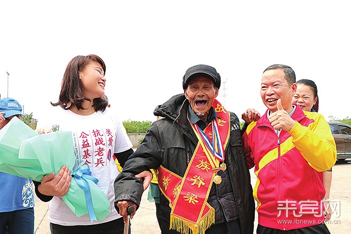 3月17日上午9时,关爱抗战老兵志愿者来宾团队的8名志愿者来到武宣县杨振兴老人家。老人一见到志愿者便大喜,知道他们是来带他回家的。在志愿者的帮助下,老人换上新衣、新帽和新鞋,兴奋地踏上了回家路。