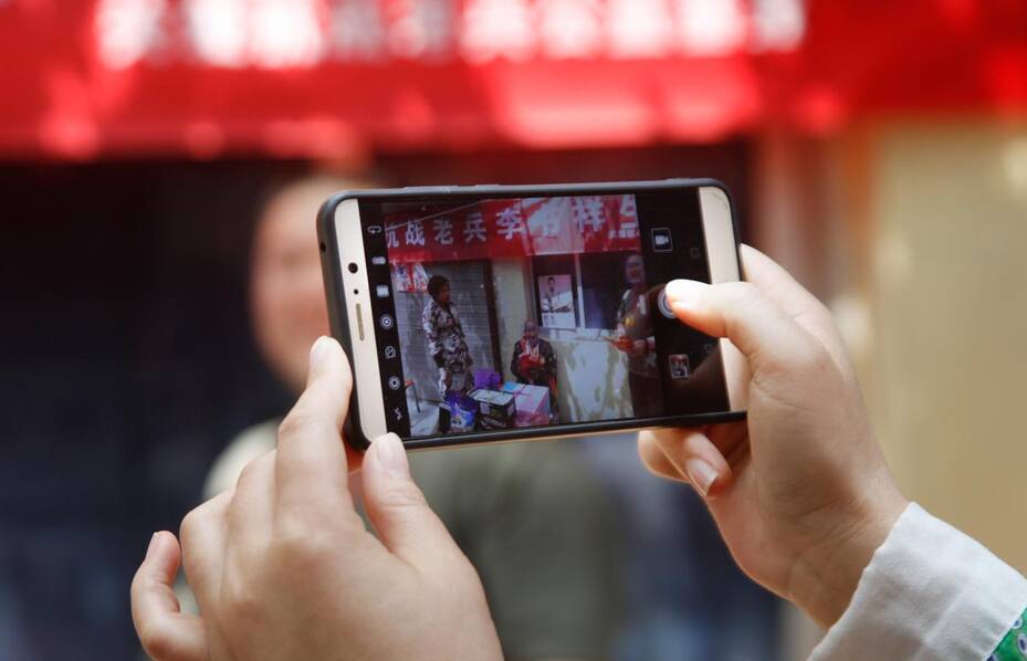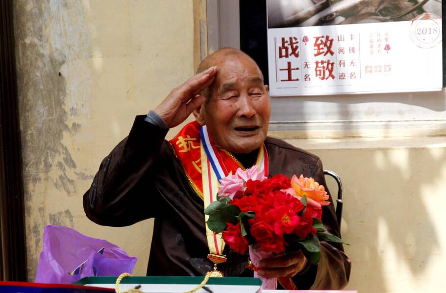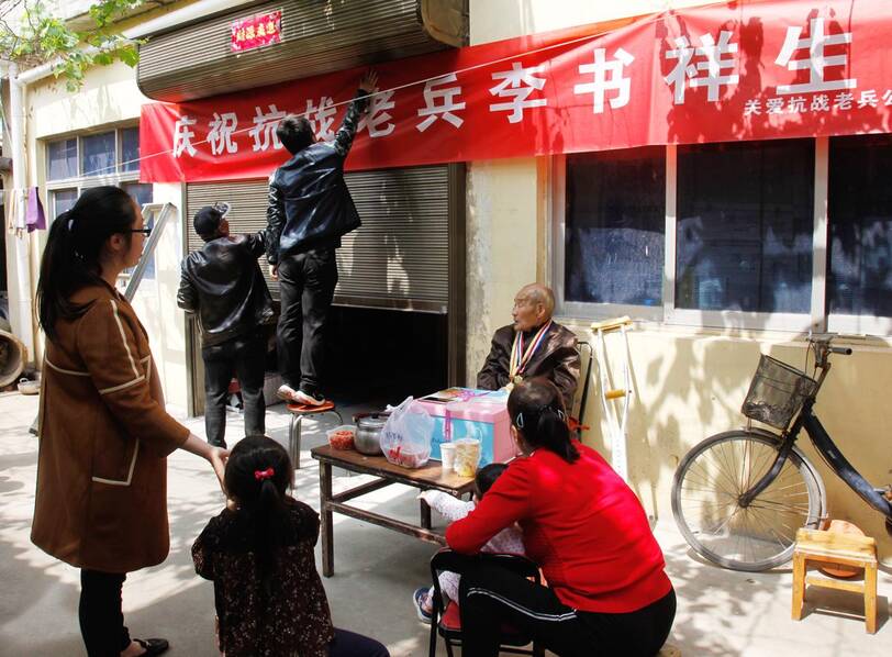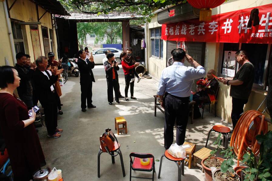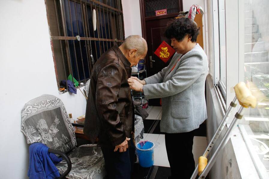 孝顺的儿媳妇在给抗战老兵整理新衣服,九十五岁的李书祥老人,除了行动有点不方便,头脑仍然思路清晰。