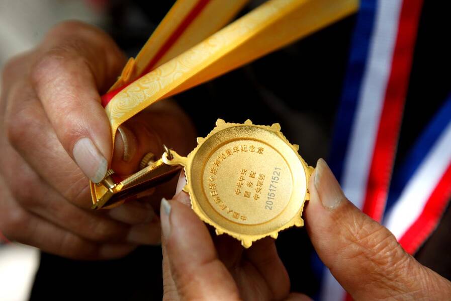 胸前挂着纪念章,身上佩着抗日英雄卫国勇士红授带,高兴的合不拢嘴。这是2015年中央军委,国务院颁发的,中国人民抗日战争胜利七十周年纪念章。