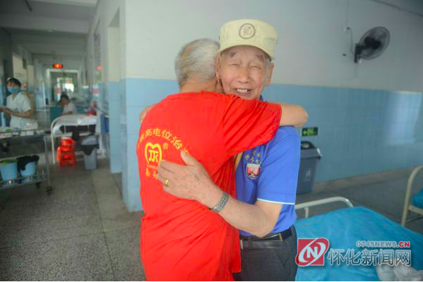 6月19日中午,93岁的杨怀亮作为志愿者,来到怀化二医院洪江医院住院部3楼,等待在此住院的抗战老兵赵宜甫。“来了,来了!”随着楼道传来一阵嘈杂声; 抗战老兵赵宜甫和他的老伴及女儿来了。