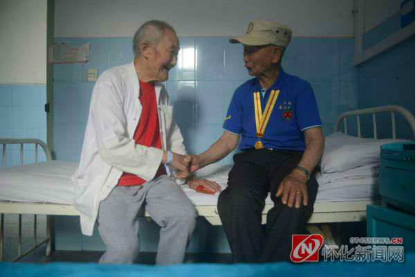 人生漫漫路,能走过90年的风风雨雨,已属不易,能亲历一段无法忘却的历史,更是难得。而身处异地的两位90多岁在广西抗战老兵,能够相聚,共叙当年抗日之情,可谓是难上加难。6月19日中午,93岁的杨怀亮,在志愿者的陪同下,来到怀化二医院洪江医院住院部3楼看望在广西抗战老兵93岁赵宜甫,他俩握手促膝,追忆当年,其情其景,令在场的后辈和志愿者感慨万千。