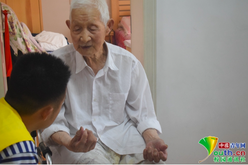 “你们年轻人一定要为国家服务!”——在慰问接近尾声时,年近百岁的老兵拉住青年志愿者的手,语重心长的告诫青年人一定要为国家和社会贡献自己的力量,落后就要挨打,只有国家强大了才不怕侵略。