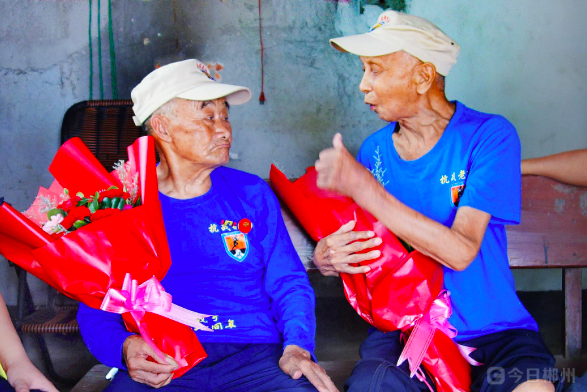 7月7日,苏仙区白露塘镇三河村,志愿者在走访慰问96岁的抗战老兵谷明元(左)和94岁的抗战老兵林茂龙,聆听老兵讲述抗战故事。
