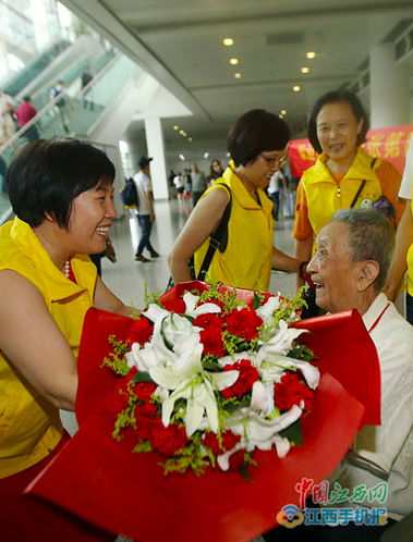 7月11日,昌北国际机场,96岁的南昌籍抗战老兵张第富眼含热泪,在志愿者的帮助下坐轮椅出来了。“这次去云南和中缅边境非常顺利,江西、云南两省志愿者一站接着一站陪同,让我在有生之年实现了愿望。”老人激动地说。