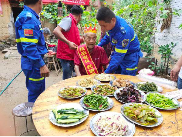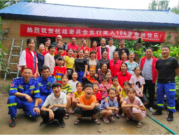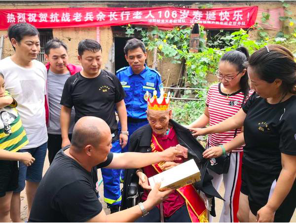 前不久,驻马店市泌阳县红十字会蛟龙义务救援队的志愿者们在队长平恩东的带领下,来到家住该县的抗战老兵余长行家中,为其庆祝106岁生日,老英雄很受感动。