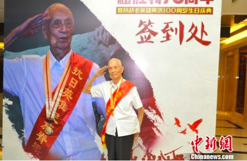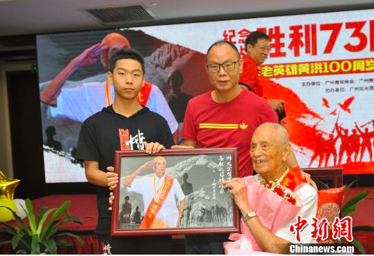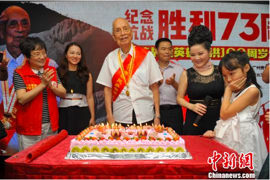 8月15日,广州青商会和社会各界100多名志愿者在广州阳光酒店为今年100岁的抗战老兵黄洪庆祝生日,回首往事时老兵一度热泪盈眶,并高歌抗战歌曲《牺牲已到最后关头》,赢得满堂喝彩。