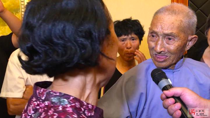 2018年8月15日,94岁抗战老兵王义青与阔别了46年的亲人一一拥抱,在抗日战争胜利73周年纪念日来临之际圆了自己的寻亲梦。这一天,当颤巍巍地伸出手抓住失散46年的妹妹的手时,这位从来都是流血不流泪的抗战老兵的眼眶湿润了。