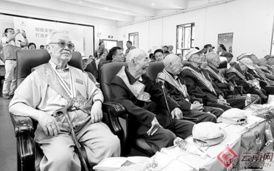 “你是93军的?”94岁的方国洪问着旁边的“战友”毕光远,两人小声地谈论起了当年。15日,云南省滇西抗战历史文化研究会《会刊》编辑部、云南老兵关怀项目计划办公室等,邀请10位抗战老兵及老兵家属,在云南陆军讲武堂举办庆祝活动。
