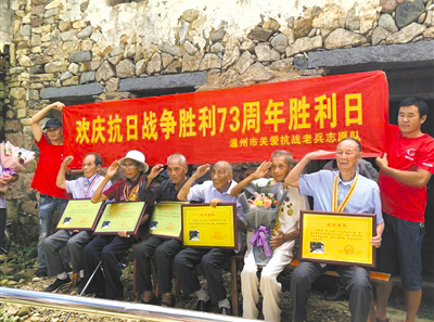 “关爱抗战老兵,不仅是对铁血抗争的家国情怀的传承,也是对人性与良知的弘扬。”这些天,温州市历史学会抗日战争研究中心副主任、温州关爱抗战老兵瑞安支队队长蔡桂顺和各方志愿者们,一直在为郑庚尧的寿宴和纪念抗战胜利73周年忙碌着。据统计,目前,温州市已知在世的抗战老兵还有65位,其中最年长者已经102岁。在政府和社会的共同努力下,这些抗战老兵均得到妥善照顾和关怀。