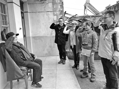 鄞州塘溪童村的抗战老兵童玉才和来看望他的志愿者互致敬礼。资料图片