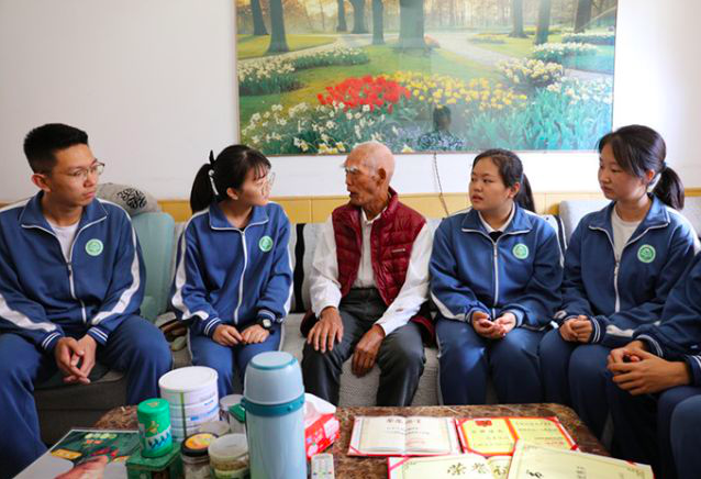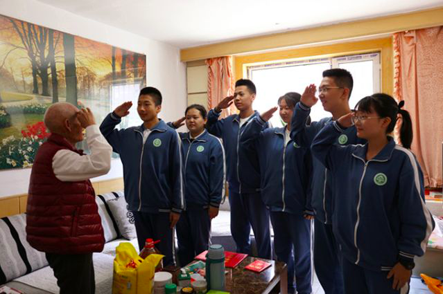 呼市第三十八中学的八名高中生组成的志愿小分队看望慰问展北社区年近90岁的张喜顺老人,老人精神矍铄,思路清晰,步履稳健,学生们与老人交流谈心,听他讲述抗战故事。老少围坐一起,手握着手,一个人讲,其他人听,情动处泪眼婆娑,却让人处处感觉温暖随行。