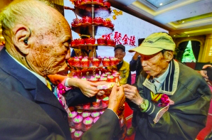 10月14日,来自江浙沪地区的61名抗战老兵相聚南京,一起欢度重阳佳节。此次老兵聚会由南京关爱抗战老兵志愿者联盟和现代快报主办,从2013年首次重阳聚会算起,这已经是抗战老兵第六年相聚南京了。这次参加聚会的老兵中,年龄最大的已经104岁,跟老战友聊聊天、唱唱抗战歌曲,大家格外高兴,他们相约明年重阳节不见不散。