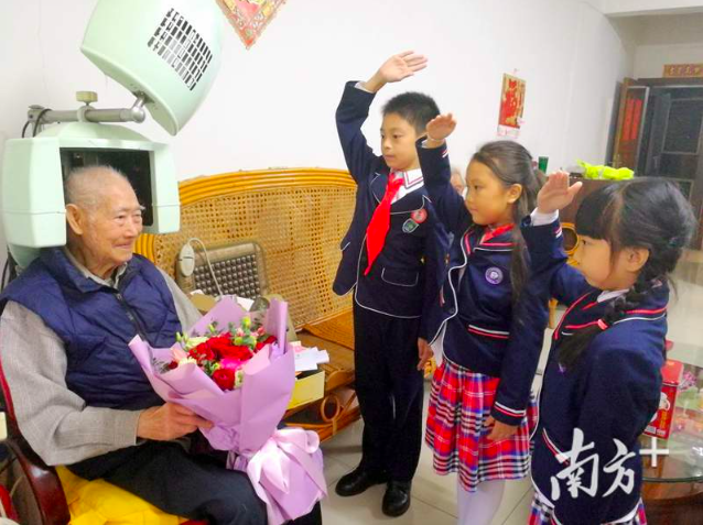 “爷爷最近身体好吗?”“祝爷爷节日快乐!”少先队员们围在文星有身旁陪他聊天,并送上节日贺卡。 “敬礼!”少先队员们齐齐向文星有行少先队礼,老人也激动地向他们回敬军礼。