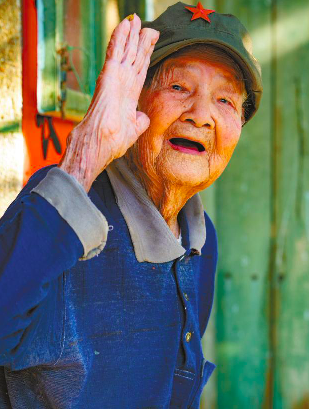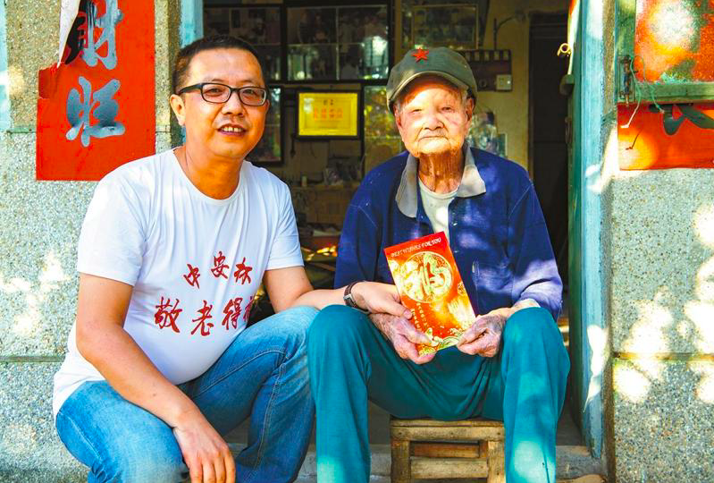 在彬塘村的探访接近尾声时,陈志永在老人耳边大声言语一番,老人朝着人们斜举起右手敬了个军礼,让人感觉眼前的这位105岁抗战老兵,既可敬,又可爱。看到众人要离去,他一定要起身送别,在光影斑驳的院落里,儿子搀扶着他,一步又一步,走得缓慢而坚定。