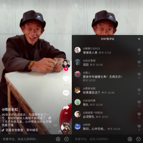 视频在抖音上获得了近8万次网友点赞、3000多条留言。不少网友通过留言方式表达了他们对抗战老兵的尊重:“在祖国危亡之时挺身而出,浴血奋战,值得我们尊敬!”“致敬抗战老兵,祝福老人健康长寿!”