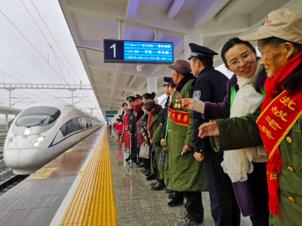 2月17日14时38分,尹生斗、刘奇元等4名抗战老兵在洞口站坐上了D7230次动车,31分钟后顺利抵达怀化南站,随后又乘坐动车返回洞口。