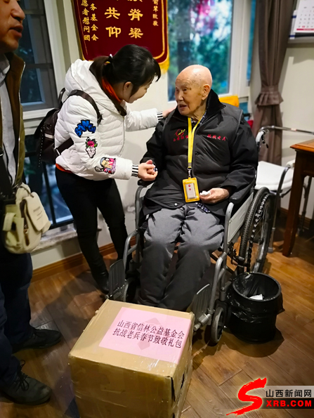 这个春节期间,全省的志愿者共为51位抗战老兵送去春节祝福,还联合外省志愿者,为在省外居住的8名山西籍抗战老兵送去祝福。“有慰问金、慰问信,有包括纸皮核桃、平遥牛肉、宁华府醋等特产在内的大礼包,还有剪纸摆件以及2019年‘国家记忆’挂历。”飞雪飘零说,春节前后,有三名老兵去世,一名是他们节前慰问过的,另两名是列入慰问名单还没来得及去慰问的。