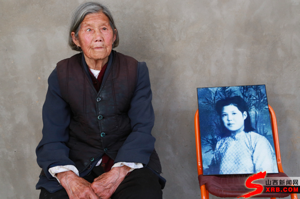 抗战老兵杨灵秀身旁摆放着自己年轻时的照片
