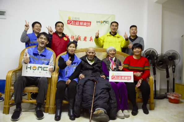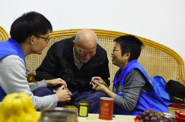 老人看到远道而来的志愿者之后,脸上露出欣慰的笑容,手拉着志愿者,不愿松开,为志愿者讲述着抗战故事。曾爷爷今年已经98岁高龄了,与自己妻子及女儿一起生活,有些腿脚不利索,走路的时候需要拄着拐杖走路。
