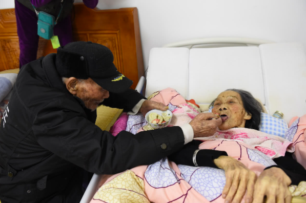原本是奶奶照顾着曾爷爷的起居生活,但由于遭受股骨断裂,两年以来都只能卧病在床。从此以后,曾爷爷每天都会亲自给自己的妻子喂饭,98岁丈夫,92岁的妻子,一段长达70多年的爱情,经历了战争的残酷,生活的困苦,如今两位老人依然在撰写着一段令人动容的爱情故事,执子之手 与子偕老。