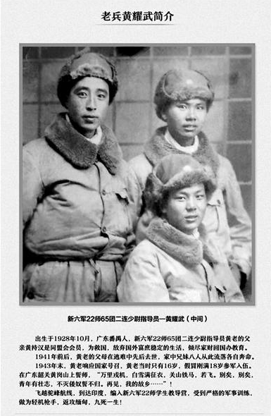 1943年,不足16岁的黄耀武和两名工友报名参军,因为自己年龄尚小,他假报年龄才得以参军,三人参军的故事还被当时的报纸报道。随后,黄耀武被编入远征军,1944年6月5日飞往印度,编入新六军22师学生教导营,作为轻机枪手参加了大部分缅甸战役的作战。抗战胜利后,黄耀武留在了辽宁,1949年11月,他在鞍钢耐火厂做成型工;1988年,他在沈阳低压开关厂退休。