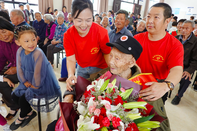5月19日,一场热闹而隆重的生日宴会在玉山镇张村文化礼堂举行。来自团县委、县退役军人事务管理局、县志愿者协会、深圳市龙越慈善公益基金会、金华市小脚丫公益基金会及东阳市的近百名志愿者齐聚张村,为抗战老兵张海德过100岁生日。志愿者们为老寿星送上鲜花、生日蛋糕及生日礼物,为全村老人表演了舞蹈、器乐、武术等十多个精彩节目,并为老人们举办了一场热闹的饺子宴。