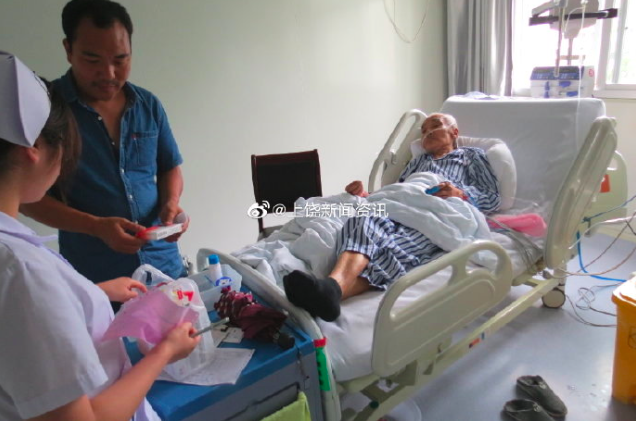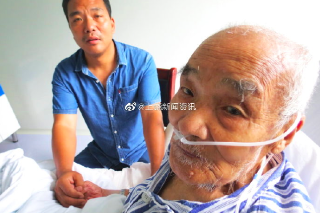 在广丰区人民医院心脏重症监护室记者见到了92岁陈德和,他戴着呼吸机,脸色苍白。和老人交流都要通过其子一句句转述。