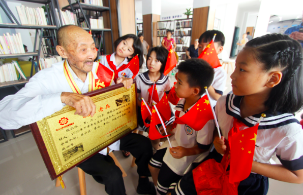 听百岁老兵讲那抗战故事 2019年07月31日 04:56 Joyue-Chang “八一”前夕,7月29日,台州市路桥区桐屿街道组织参与“春泥计划”活动的小朋友来到今年102岁的抗战老兵陈仁济家中,听陈老战士讲述抗日战争的故事,对小朋友进行一次爱国主义教育。 (时间:2019年7月30日 来源:中国台州网 责任编辑:余彩虹、刘锦萍)