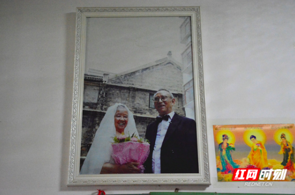 在墙上,一张赵金义和妻子胡细芝的结婚照分外显眼。胡细芝告诉我们:“这是前两年古郡志愿者协会为我们拍的,有生之年能和老伴拍一组结婚照,也算是圆满了。”据了解,这也是志愿者们第四次为赵金义过生日,逢年过节看望抗战老兵这也成为协会志愿者们无声的共识。