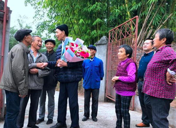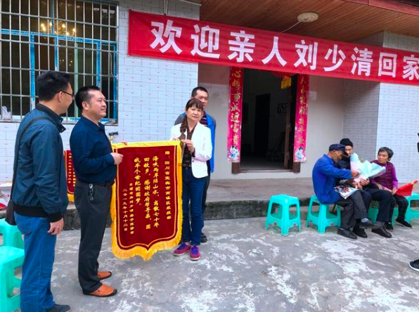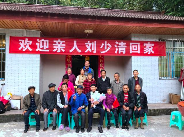 10月13日,秋高气爽!亲人、老乡们远远地迎接91岁台胞刘少清先生。四川省宜宾市南溪区长兴镇东岩村三队周明友家,因为亲人的归来,仿佛过年般热闹,院墙上鲜艳的横幅写着“欢迎亲人刘少清回家”的字样。
