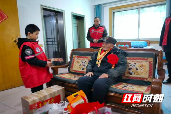 “亲爱的老兵,因为你们曾经的付出,才有了我们幸福的今天......我们只希望您身体健康,我们还要陪您走过更多的春夏秋冬,听您继续讲抗战的故事......”当就读于安乡县深柳镇城东小学三年级的一位小志愿者,给家住在安乡县深柳镇五总社区94岁的抗战老兵李家忠行了一个庄严的少年队礼、念完春节慰问信后,老兵眼眶红了。“谢谢你们这些年来看望我,感谢党和政府。”老兵激动得连连道谢。