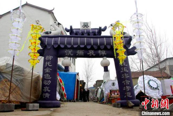 天空阴沉、薄雾弥漫、雪花飘洒。14日,在山东省济宁市微山县韩庄镇小房头村街道上,百余民众神情肃穆、缓步前行,泪别抗战老兵、南京大屠杀亲历者孙晋良。