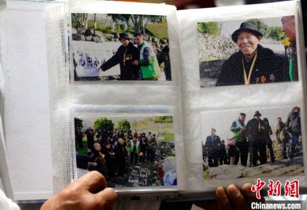 孙晋良的亲属向中新网记者展示孙晋良生前的照片。图中所展示的是孙晋良在家人及志愿者的陪同下,于2015年参加南京大屠杀公祭日时的留念图片。 沙见龙 摄