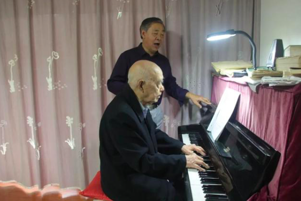 ▲曾令端和学生陈和昭弹唱《在松花江上》