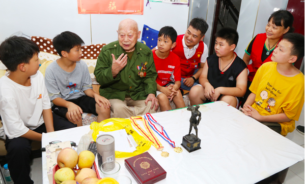 8月11日下午,亳州市涡阳县94岁抗战老兵张学义的家里,几名小学生在共青团涡阳县委兼职副书记、县爱心者协会会长尹冬冬的带领下,聆听张爷爷讲述抗战故事,上了一堂生动的暑期思政课。