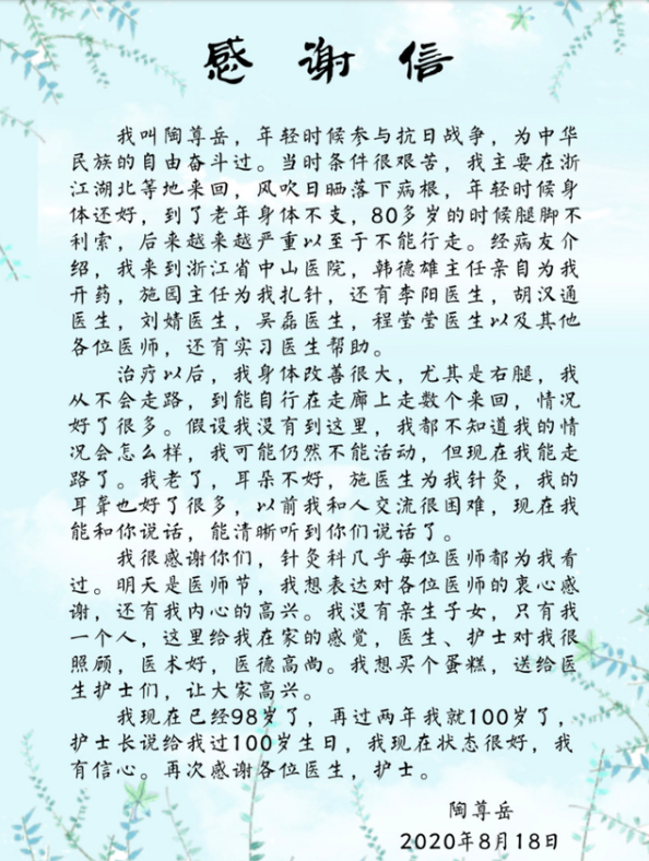 “同学,明天就是医师节了,我特别想给你们科的医生们写一封感谢信,但是我眼睛不好,写字又慢,来来回回写了几遍还是不满意。我有好多想说的话,我来口述,你能不能帮我记录一下?”8月18日下午,一位步履蹒跚的老人拄着拐杖走进了浙江省中山医院针灸科医生办公室,拉住了一位实习医生发出了这样的请求。