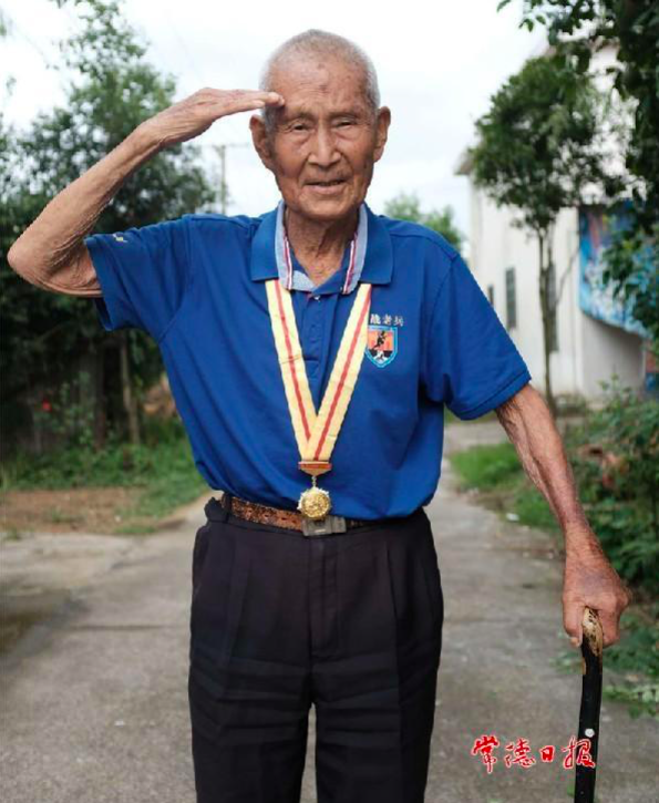 抗战老兵龙瑞清行军礼。