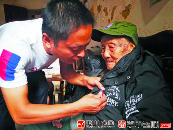 当天上午,在老兵陈佐刚家,当收到来自广东的“关爱抗战老兵公益基金”抗战胜利75周年致敬礼包时,老人感慨地说:“两广是真兄弟!”今年100岁的陈佐刚是原中国驻印军独立战车第三营汽车兵,抗战期间曾到印度、缅甸参加远征军。老人乐观开朗,作息规律,胃口好,子孙孝顺,在县城东门岭小区过着恬静的晚年生活。他的记性非常好,这次志愿者到来,他还再三叮嘱孙媳妇拿出志愿者此前落在他家的红印油交还给志愿者。