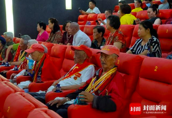 李圣言(前排右一)近期同战友一同看抗战题材电影