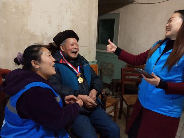 昨日上午公益志愿服务队再次来到居住在萍乡学院的抗战老兵杨玉清家中,当队长李淑明和队员们,帮老人家穿上深圳龙越慈善基金会馈赠的毛绒马甲、佩戴好纪念牌纪念章后,老人感到特别暖和,饱经风霜的脸盘绽放出爽朗的笑容。