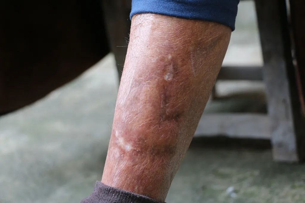 杨振兴被弹片擦伤的左腿。