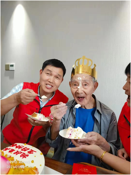 对每一位健在的老兵,林华强和志愿者可谓用尽心思。105岁的金家社和95岁的陈立寿,是两位生日相近的战友。志愿者为两位老寿星张罗了一场别开生面的集体生日宴,场面温馨、美好。消息在网上一公开,远在上海的爱心人士也赶来了。